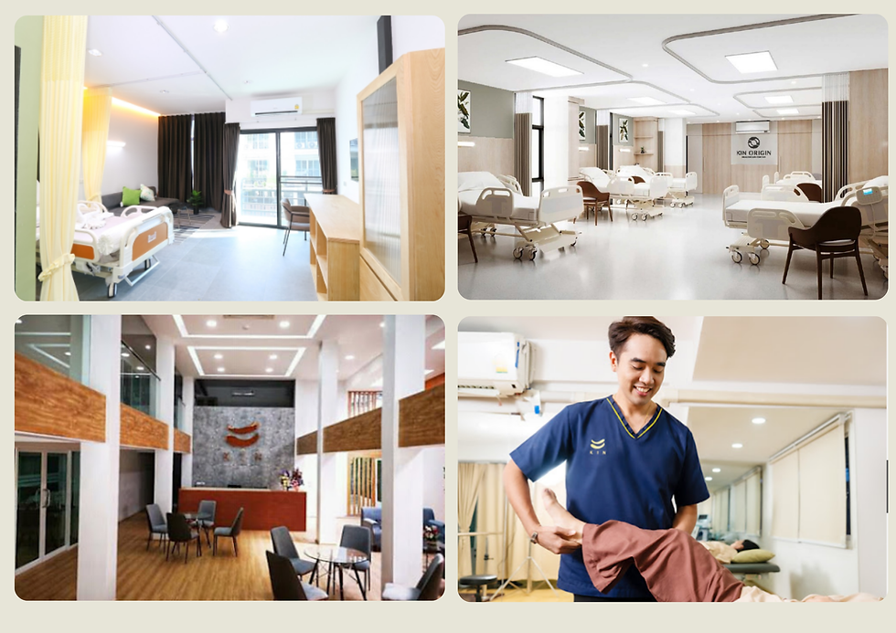 Universal Nursing Home | Near Airport & Major Highways | Supported (24/7 trained caregivers) | PT up to 3x/week, Thai massage, meditation | VIP Single, Double, Multi-bed | Direct hospital link, oxygen machines, air beds |